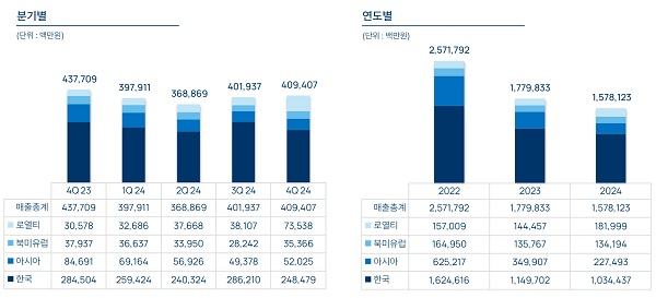 이를 합한 2024년 연간 실적은 매출이 전년대비 11% 감소한 1조 5,781억 원, 영업이익은 전년대비 적자 전환하며 1,092억 원의 손실이 발생했다. 연간 손실은 상장 후 처음이다. 당기순이익은 전년대비 56% 감소한 941억 원을 기록했다. 4분기 및 연간 실적에서 발생한 영업손실은 전사 구조 개선에 따른 퇴직위로금 지급 등 일회성 인건비 발생과 신작 출시 마케팅비 증가로 인한 것이다.