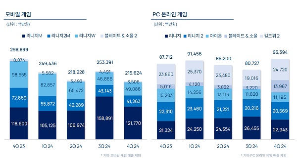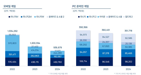 연간 게임별 매출에서는 모바일 게임이 9,367억 원으로 전년 대비 22% 감소했다. ‘리니지M’이 4,927억 원으로 가장 많았고 ‘리니지W’가 2,442억 원으로 그 뒤를 이었다. PC 온라인 게임은 3,518억 원으로 전년 대비 2% 감소했다. ‘리니지’가 982억 원, ‘블레이드&소울’이 926억 원, ‘리니지2’가 854억 원 순이었다.