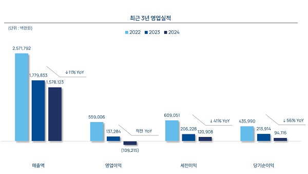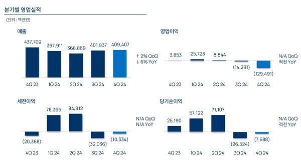 매출은 전분기대비 2% 증가했지만 전년동기대비 6% 감소했으며, 영업이익은 전분기대비 및 전년동기대비 적자 전환했다. 당기순이익은 전분기대비 적자지속, 전년동기대비 적자 전환했다.
