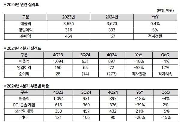 네오위즈는 2024년 연간 매출 3,670억 원, 영업이익 333억 원으로 전년 대비 비슷한 수준을 기록했다. 당기순손실은 67억 원으로 적자전환했다.