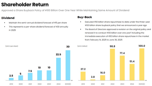 한편, 넥슨은 지난해 발표했던 자사주 매입 정책의 잔여분 500억 엔의 집행 기한을 2027년에서 2026년으로 앞당기고, 같은 기간 500억 엔 규모의 자사주를 추가로 매입해 총 1,000억 엔 규모의 자사주를 1년 이내에 매입한다고 밝혔다. 2025년 넥슨의 자사주 매입은 2월 14일부터 6월 30일까지 진행될 예정으로 총 500억 엔(한화 약 4,575억 원) 규모다.