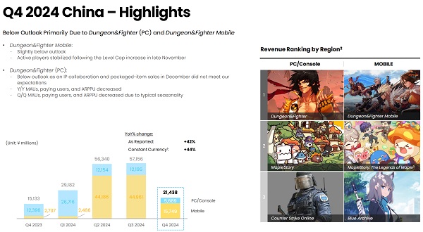 ‘메이플스토리’ IP에서는 PC ‘메이플스토리’의 해외 매출이 전년 대비 24% 성장을 기록하며 북미와 일본 지역에서 3분기에 이어 4분기에도 분기 최고 매출을 경신했고, ‘FC’ 프랜차이즈는 4분기에 전년 동기 대비 매출이 증가했으나, 연간으로는 사상 최고 실적을 기록했던 2023년 대비 감소했다.