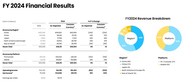 2024년 넥슨의 연간 실적은 매출이 전년대비 5% 증가한 4조 91억 원, 영업이익은 전년대비 8% 감소한 1조 1,157억 원, 당기순이익은 전년대비 91%가 증가한 1조 2,116억 원이었다.