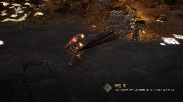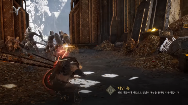 ▲ 체인 훅은 뒤로 약간 점프하면서 체인으로 전방의 대상을 끌어당겨 공격한다. 다수의 적을 모으는 용도와 함께 끌어온 적들을 왼손에 장착한 방패로 공격한다. 체인으로 끌고 올 수 있는 적들은 5마리 이상이며, 넉넉한 사정거리로 적들과의 간격을 빠르게 좁힐 때 사용하면 좋아 보인다.