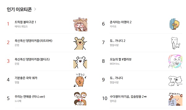 또한 많이 선물하는 이모티콘 순위에서도 남성 10대와 40대, 50대 이상에서 1위를 차지했고, 20대와 30대에서 2위를 차지했다. 여성의 경우 10대와 50대에서 3위, 20대와 30대에서 5위, 40대에서 9위에 오르며 남성의 압도적 지지를 받은 것으로 나타났다.