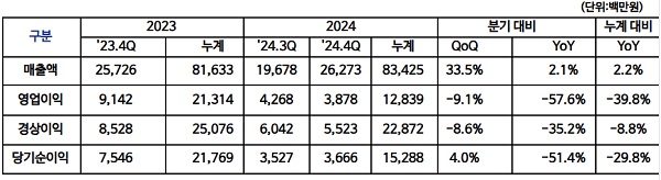 2024년 4분기는 매출 263억원, 영업이익 39억원, 당기순이익 37억원으로 전분기 대비 매출 33.5%, 당기순이익 4.0% 상승했고 영업이익은 -9.1% 하락했다. 전년동기대비 매출은 2.1% 상승했지만 신작 마케팅으로 인해 영업이익과 당기순이익은 -57.6%, -51.4% 하락했다.