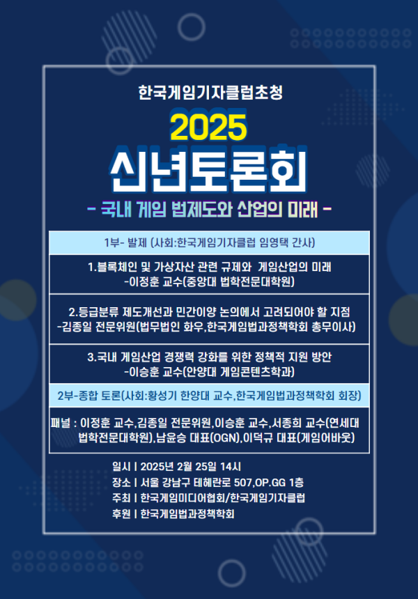 한국게임미디어협회 이택수 회장은 ”2025년을 맞아 게임산업의 발전을 뒷받침할 수 있는 정책의 방향성 및 규제와 현실의 괴리에 대해 업계 관계자들이 함께 논의하고 의견을 나누기 위해 이번 토론회를 기획했다“며 “국내 게임업계의 상황을 진단하고 미래에 대한 인사이트를 얻을 기회인 만큼 많은 관심을 부탁드린다”고 밝혔다.