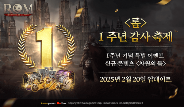 레드랩게임즈(대표 신현근)는 자사가 개발하고, 카카오게임즈(대표 한상우)와 함께 글로벌 동시 서비스를 진행중인 정통 하드코어 MMORPG ‘롬(ROM: Remember Of Majesty)(이하 롬)’의 글로벌 서비스 정식 출시 1주년 감사 축제를 진행한다고 20일 밝혔다.
