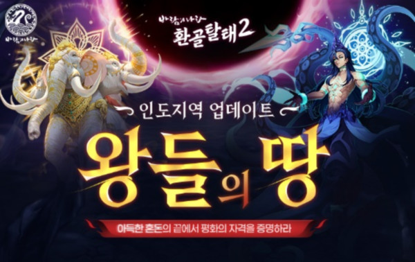 '환골탈태2’ 3차 업데이트로 선보이는 ‘왕들의 땅’은 8차 승급 이후 즐길 수 있는 신규 최상위 사냥터로, 실제 인도 신화에 존재하는 지역을 새롭게 해석해 구현한 것이 주요 특징이다. 지역 보스로는 신성한 코끼리 '아이라바타', 불의 신 '아그니', 물의 신 '바루나', 파괴의 신 '시바' 등 인도 신화에 기반한 4종의 신규 지역 보스가 등장한다.