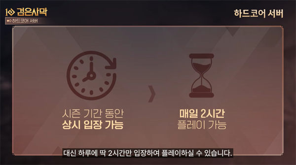 클래스, 스킬 등에 따라 성장 속도가 엇갈리기 때문에 하드코어 서버는 시즌마다 컨셉을 정하고 플레이 가능한 캐릭터를 제한한다. 첫 시즌에는 워리어 소서러, 레인저, 자이언트 등 초창기 기본 캐릭터 4종만 제공한다. 기본적인 콘텐츠 구성은 과거 유저들에게 즐거움을 선사한 '그림자 전장'을 따라간다. 하드코어 서버의 목적은 성장과 장비의 압박에서 벗어나, 즐거운 게임 방식을 제공하기 위해 만들어졌다.