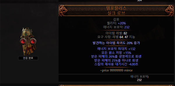 '템포랄리스 실크 로브' 전설 갑옷은 '패스 오브 엑자일2' 엔드 콘텐츠의 종착 지점으로 불리는 아이템이다. 스킬의 재사용 대기 시간 감소 옵션을 활용해 다양한 스킬들의 빠른 연계가 가능해지면서 집중 조명을 받았다. 특히 오픈 시즌의 종결 빌드로 불리는 점멸 관련 빌드 연계와 치명타 시, 시전과 합쳐진 최상등급 빌드 구성으로 인해 여전히 인기가 좋다.