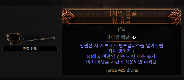 '마지막 불길 향 유물'은 최대 명예가 1로 변환되는 대신, '템포랄리스 실크 로브'를 확정적으로 얻을 수 있기에 한 방에 자로크를 잡을 수 있는 유저들에게 인기가 좋다. 자로크에게 얻을 수 있고, 엄청난 가격을 자랑해 파밍의 가치를 높여준다. 대신 일회성 아이템이고, 명예 1의 리스크가 크기 때문에 직접 사용시 효율은 장담할 수 없다.