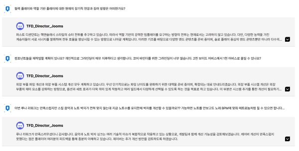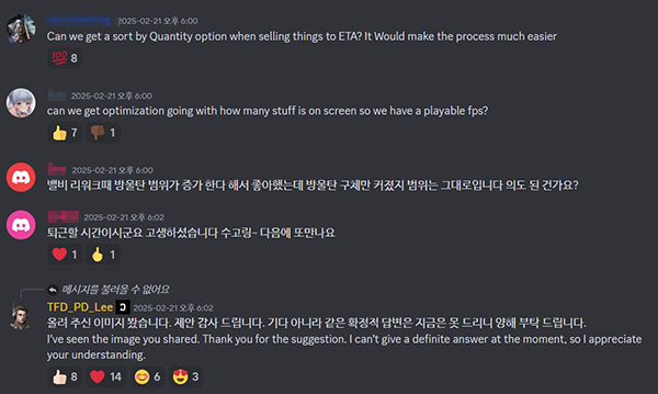 이처럼 인기 상승은 수영복 효과도 있지만, 사실 궁극적인 원인은 지속적인 '소통'이라는 부분에 주목할 필요가 있다. 유저와의 소통 창구로 마련한 공식 디스코드에 지난 11월, 채팅 채널 dev-qna을 개설하여 개발을 책임지고 있는 이범준 총괄 프로듀서와 주민석 크리에이티브 디렉터가 전 세계 유저의 질문에 실시간으로 답변하는 자리를 마련했다.