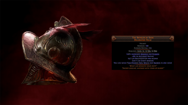 첫 소개로 등장한 독특한 전설 아이템 2종은 시작부터 눈길을 사로잡았다. 비의 인도자(The Bringer of Rain)로 이름 붙은 헬멧 장비는 독특하게 갑옷류 장비를 포기하는 대신, 두 손 장비를 한 손에 들 수 있게 해주는 옵션을 가지고 있으며, 다양한 연구가 이어질 것으로 예상된다.