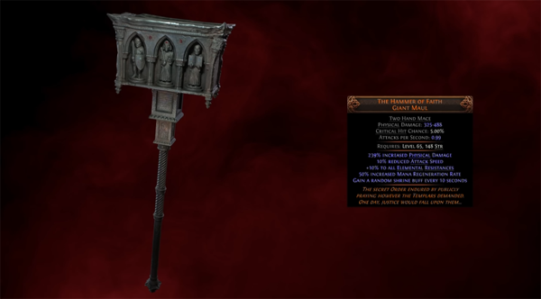 또한, 신념의 망치 양손 철퇴(Hammer of Faith Two-Handed Mace)는 10초마다 무작위 성소 버프 효과를 받을 수 있도록 설계되어 있다. 이미 버프 획득과 발생 등 관련 장비들이 존재하면서 이들과 연계하여 독특한 빌드가 만들어질 수 있는 역할을 맡을 것으로 보인다.