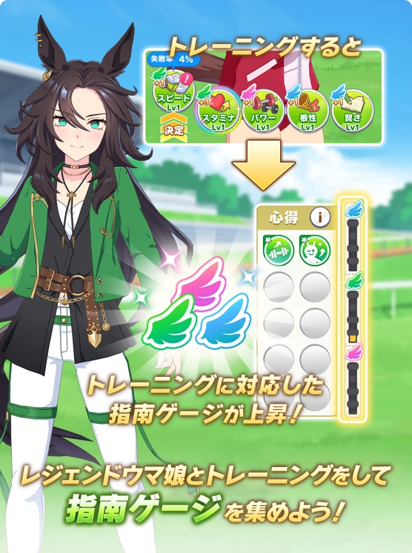 지시 게이지는 우정 훈련을 통해 더 많이 쌓을 수 있다. 또한, 새롭게 등장한 그룹 지원 카드 'SSR 전설의 구현자'와 트레이닝 후 발생하는 육성 이벤트나 외출 이벤트에서도 늘릴 수 있다.
