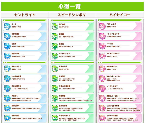 클래식 등급의 3월 하순에 처음으로 ☆3 마음가짐을 습득할 수 있으며, 여름 합숙 직전인 클래식 등급 6월 하순까지 최대 2종류의 ☆3 마음가짐을 습득할 수 있다. 게임 내에서 등장하는 마음가짐 목록은 다음과 같다.