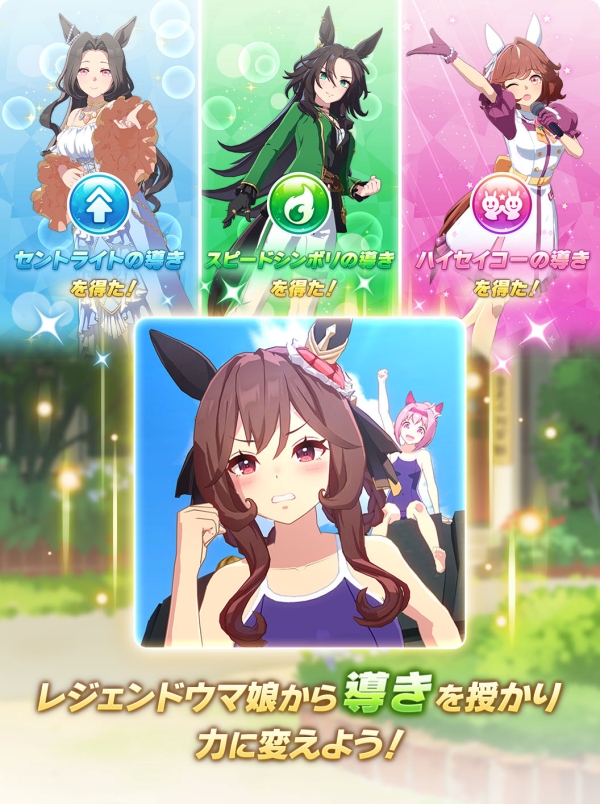 이미 발표된 바와 같이 세인트 라이트(CV: 노토 마미코), 스피드 심볼리(CV: 사와시로 미유키), 하이세이코(CV: 탄게 사쿠라)의 3명이 레전드급이다. 경마에 대해 잘 아는 사람이라면 이번에 새롭게 등장한 우마무스메의 이름을 들어본 적이 있을 것이다. 참고로 경주명인 '세인트 라이트 기념'은 이 세인트 라이트에서 유래한 것이다.