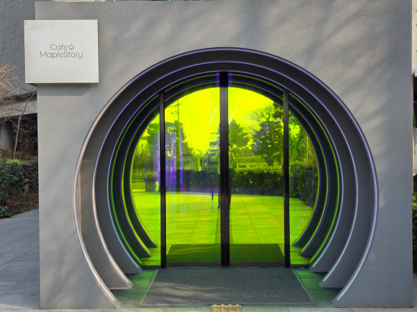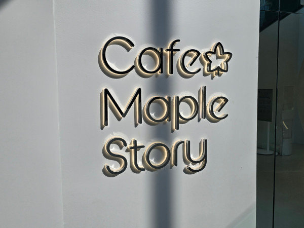 '카페 메이플스토리'는 외부의 동그란 문을 통해 입장할 수 있고, 내부에서 에스컬레이터를 이용해 입장할 수도 있는 공간으로 만들어졌다. 카페 입구에는 이름이 예쁘게 만들어졌다.