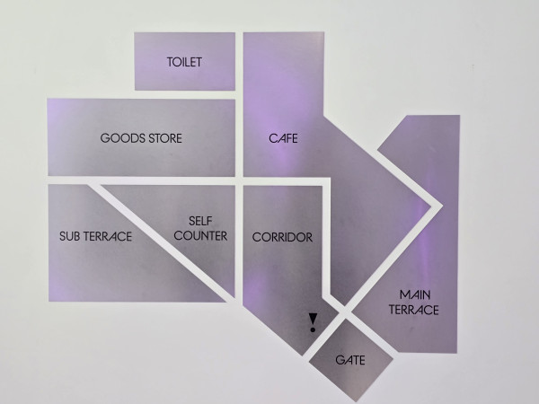 카페는 내부 공간과 테라스 공간이 있다. 내부에는 대형 LED 화면에서 영상이 상영되고 있고, 색을 입힌 창문을 통해 화려한 색깔로 공간이 채워진다. 날씨가 좋으면 테라스에서 하늘을 보며 휴식을 취할 수도 있다.
