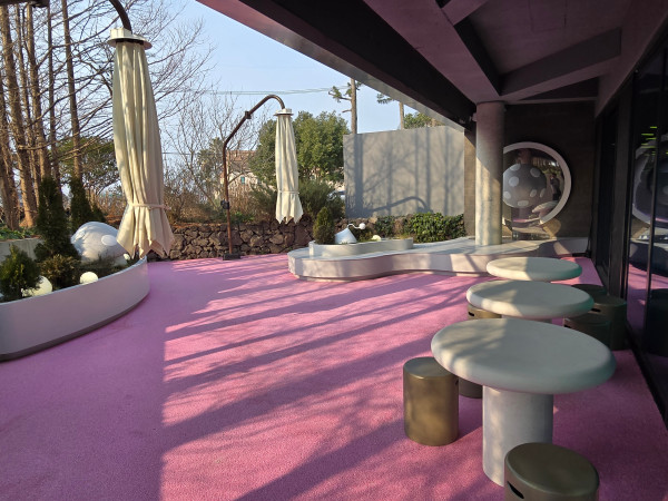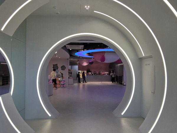 내부 공간은 카페와 굿즈 스토어, 테라스 등으로 구성되어 있다. 매장 입구 역시 원형으로 만들어져 몽환적인 느낌을 준다.