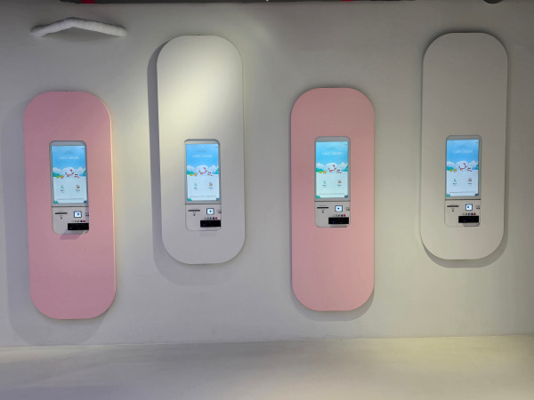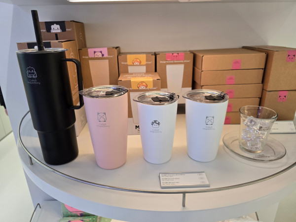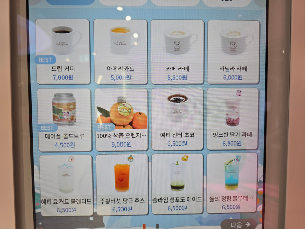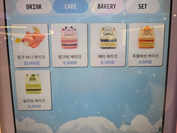 먼저 카페를 이용하려면 키오스크를 이용해야 한다. 메뉴 구성은 음료와 케이크, 베이커리, 세트 등으로 되어 있다. 케이크는 5종이 있으며 베이커리는 스콘 메뉴에 더해 크림빵이 추가됐다. 음료는 10종 이상이 준비되어 있다. 카페 관계자에 따르면, 모든 메뉴 중 가장 인기가 많은 것은 '핑크빈 딸기 라떼'라고 한다.