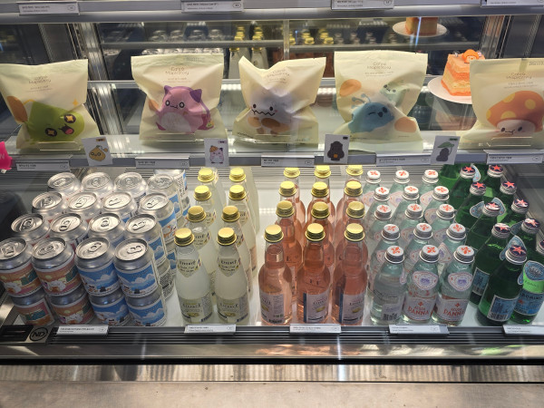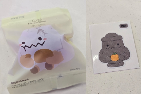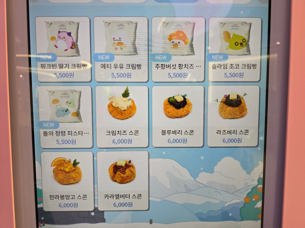 카운터 옆에는 제조 음료를 제외하고 실제로 제공되는 메뉴들이 보여지고 있다. 자세히 보면 크림빵 앞에 띠부띠부씰이 붙어있는데, 이 씰 중 하나가 빵 안에 들어있다.