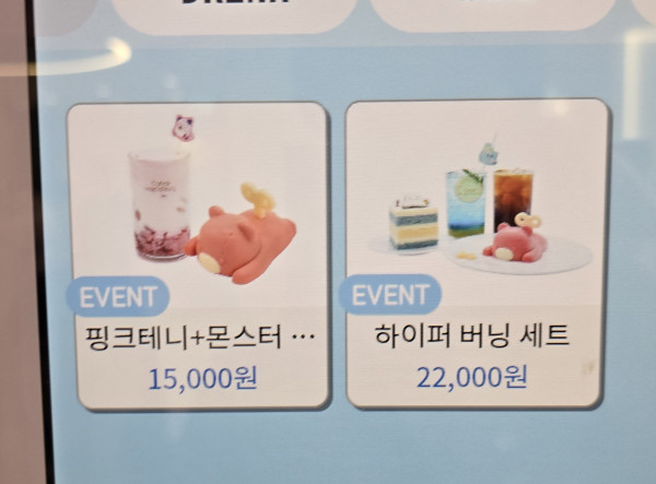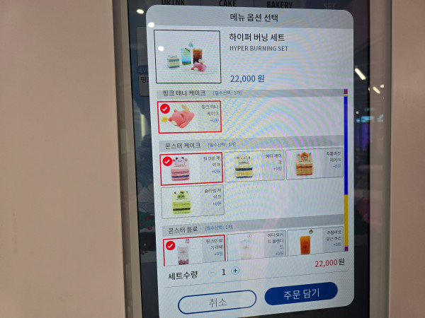 세트 메뉴는 2종이 있는데, 그중 하이퍼 버닝 세트가 가장 가성비가 좋다. 핑크 테니 케익과 몬스터 케이크, 몬스터 음료, 커피 등의 구성이 22,000원이다. 따로 주문하면 3만원이 훌쩍 넘는다. 2인 이상이 방문했다면 하이퍼 버닝 세트를 추천한다.