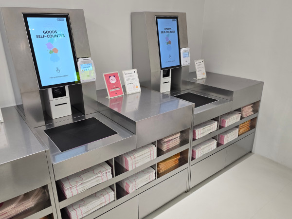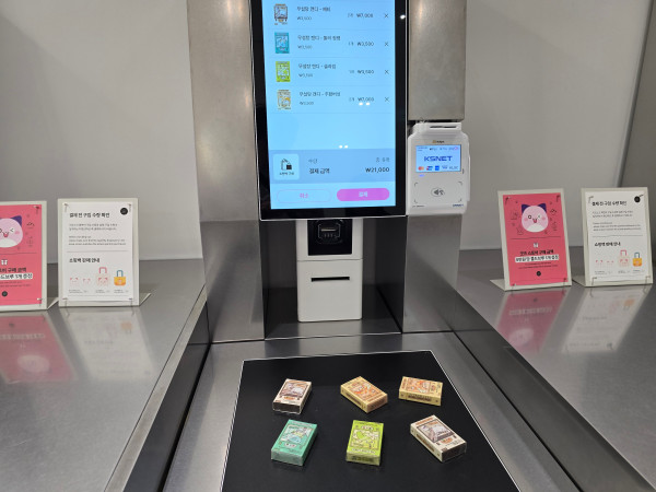 구매할 굿즈를 다 골랐으면, 셀프 계산대를 통해 구매할 수 있다. 보통 일일이 바코드를 들이밀며 계산을 하는데, 이곳에서는 검은 판 위에 대충 올려놓기만 해도 물품의 측정이 이뤄지는 신기한 모습을 보여줬다.