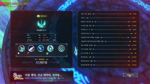 반복되는 게임플레이는 종료 후 캐릭터 강화로 이어지면서 더 멀리 스테이지를 이어갈 수 있는 원동력을 제공한다. 첫 번째 보스부터 난이도는 높게 설정됐다. 플레이어는 반복되는 전투로 캐릭터를 강화하고, 캐릭터마다 부여된 스킬과 정수의 조합을 찾아 나가면 다음 단계로 나아갈 수 있다.