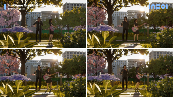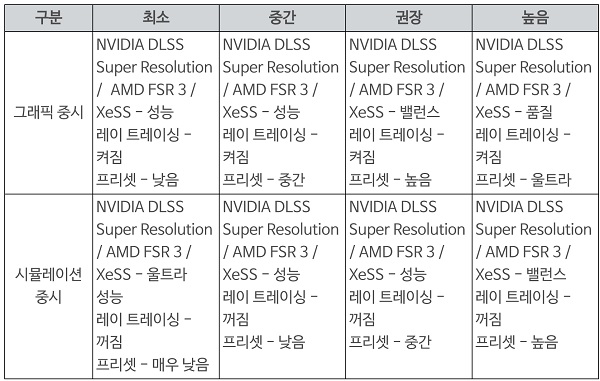 이 세팅값을 살펴보면 업스케일링 기술인 DLSS나 FSR, 레이 트레이싱, 프리셋 등의 설정이 다른 것을 확인할 수 있다. 그래서 그래픽을 중시하는 유저는 레이 트레이싱 설정을 켜야 하며, 시뮬레이션에 영향을 미치는 부분은 전체적인 프리셋의 단계를 그래픽 중시 대비 낮추는 것이다. DLSS나 FSR의 옵션 설정값도 모두 다르다.