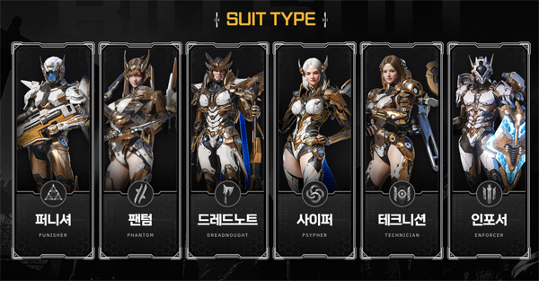 각각의 슈트는 SF 세계관에 걸맞는 외형과 기능들을 가지고 있어 익숙하지 않다면 초반 선택의 어려움이 있다. 하지만 기존 MMORPG의 방정식을 따라가고 있기에, 조금만 살펴보면 자신에 알맞은 슈트를 고르는 것이 가능하다. 게임은 기본적으로 탱딜힐 구도의 파티 플레이를 지향한다.