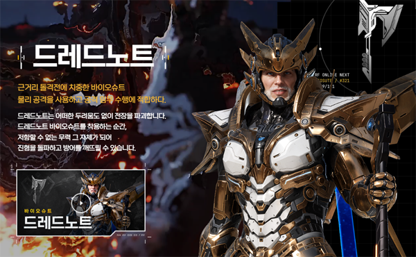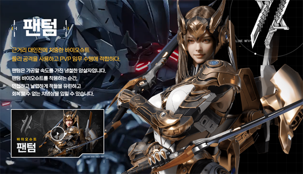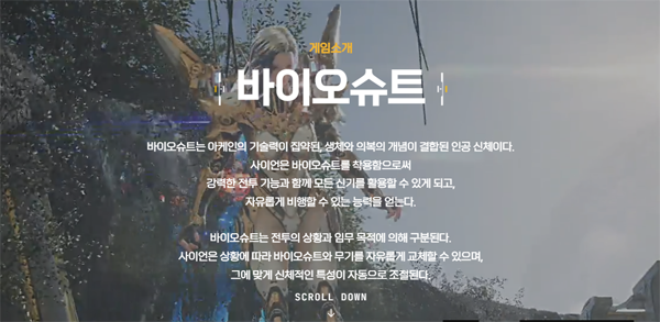 6종의 바이오 슈트는 각기 다른 특징을 보유하고 있다. 근거리와 원거리부터 물리 공격과 사이퍼 공격 같은 대미지 성질의 구분, 딜러와 지원 등 슈트 성향의 구분까지 나뉘어져 있어 유저들의 플레이 스타일에 맞게 게임을 이어갈 수 있도록 만들었다.