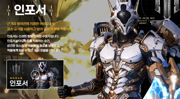 유저는 'RF온라인 넥스트'에서 6종의 바이오 슈트 선택이 가능하다. 바이오 슈트는 다른 게임에서의 직업과 클래스로, 다양하게 분화되어 있는 슈트를 선택해 플레이를 이어갈 수 있다. 슈트는 한 번 선택으로 끝나는 것이 아닌 자유롭게 교체하고 활용할 수 있는 것이 게임의 또 다른 특징이다.