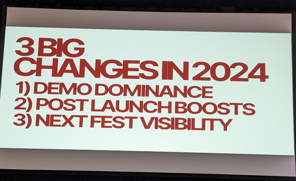 주코프스키에 따르면, 2024년 스팀의 큰 변화에서 주목할 점은 '데모 우월주의화', '출시 후 부스트', 'NEXT 페스트의 유효 활용'의 세 가지로 압축된다.
