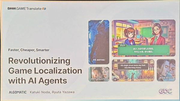 미국 샌프란시스코에서 개최 중인 '게임 개발자 콘퍼런스 2025'에서 Algomatic의 DMM 게임 번역 노다 카츠키 제너럴 매니저와 야자와 류타 수석 번역가가 'Faster, Cheaper, Smarter: Revolutionizing Game Localization with AI Agents(더 빠르고, 더 저렴하고, 더 스마트하게: AI 에이전트를 통한 게임 현지화 혁신)'라는 주제로 강연을 진행했다.
