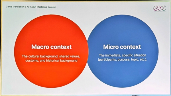 야자와 대표는 “게임 번역은 모두 문맥을 마스터하는 것과 관련이 있다”고 강조하며, 문맥을 두 가지 범주로 분류해 설명했다.