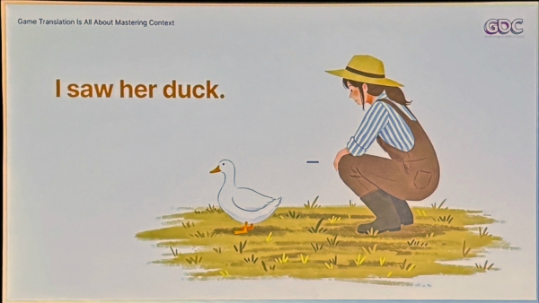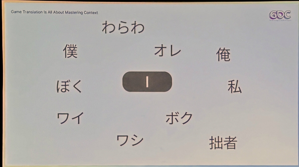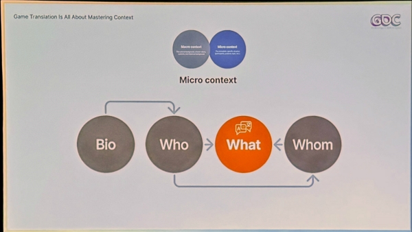 “게임 현지화에 참여한 경험이 있는 사람이라면 누구나 '문맥을 좀 더 제공해 주세요'라는 메시지를 300만 번 정도 쓰거나 읽은 적이 있을 것"이라고 말해 장내 웃음을 자아낸 뒤, 다음과 같이 말했다.