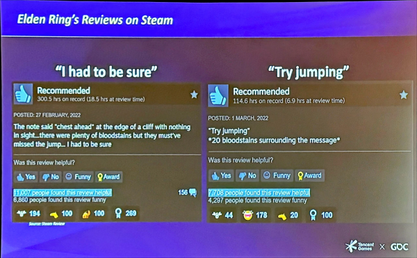 그는 '엘든 링'을 예로 들며, 가장 유용한 피드백은 “절벽 옆의 보물상자 안에는 아무것도 없었다. 확인하지 않을 수 없었다"와 같이 기억에 남는 순간이 중요하다고 지적했다. 플레이테스트는 단순한 Q&A 세션이 아니라 플레이어에게 기억에 남는 순간을 수집하고 검증하는 과정이라는 것이다.