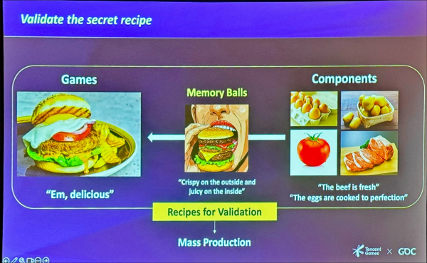 세 번째 팁은 '레시피를 검증하라'는 것으로, 햄버거의 비유를 들어 설명했다. 햄버거의 재료(계란, 토마토, 양파, 소고기 등)와 게임의 요소(총, 컨트롤, 벙커 등)는 비슷하다. “게임이 전반적으로 재미있나요?"라고 묻는 것은 ‘햄버거가 맛있나요?’라고 묻는 것과 같다. “맵의 크기는 적당합니까?"라고 묻는 것은 ‘쇠고기의 질은 어떻습니까?’라고 묻는 것과 같다.