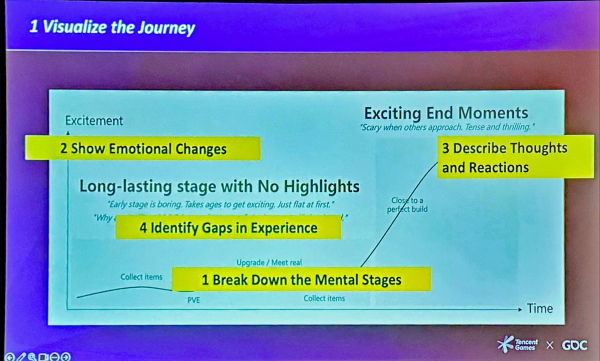 1. 여정 시각화: 흥분도 곡선과 같은 도구를 사용하여 플레이어가 게임에서 따라가는 다양한 경로를 보여준다. 플레이어가 게임을 플레이하는 동안 경험하는 다양한 단계를 식별하고 감정의 변화를 시각화한다. 플레이어의 다양한 시점의 생각과 행동을 설명한다.