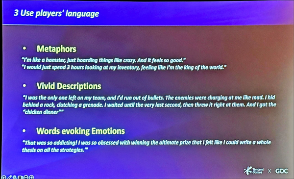 3. 플레이어의 언어 사용: 레벨 디자인이나 히트박스와 같은 기술 용어가 아닌, 플레이어가 사용하는 언어로 공유하면 이해도가 높아진다. 특히 '햄스터처럼 물건을 모으는 것이 기분 좋다'와 같은 비유, '한 명만 남겨진 데다 탄약이 떨어져서'와 같은 현장감 있는 묘사, '승리에 집착하게 되었다'와 같은 감정을 불러일으키는 단어가 효과적이다.