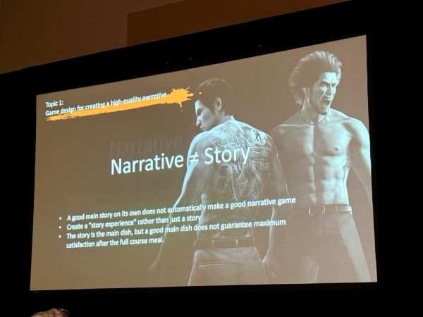강연의 서두에서 호리이 프로듀서가 제시한 메시지는 'Narrative ≠ Story'(내러티브는 단순한 스토리가 아니다)였다. 양질의 스토리를 준비하는 것이 좋은 내러티브 게임을 만드는 것과 직결되지는 않는다. 내러티브는 플레이어가 게임에서 스토리를 어떻게 느끼고 의미를 부여하는지가 중요하며, 용과 같이 스튜디오에서는 단순히 스토리를 이야기하는 것이 아니라 스토리를 '경험'에 녹여내는 데에 집중하고 있다고 한다.