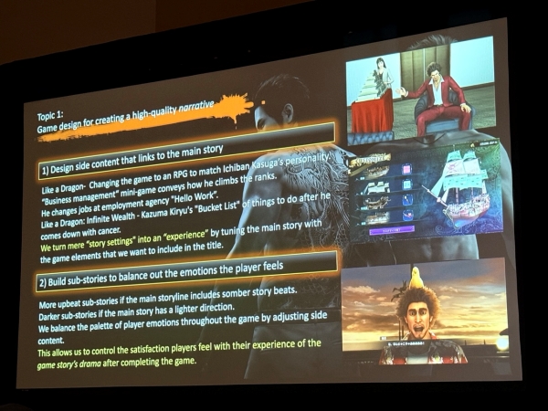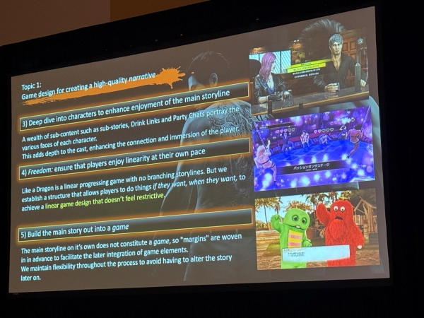 이어 양질의 내러티브 게임을 만들기 위한 5가지 디자인 가이드라인을 소개했다. 첫 번째로 중요한 것은 사이드 콘텐츠를 메인 스토리와 유기적으로 연결하는 것이다. 카스가 이치반이 등장하는 '용과 같이 7: 빛과 어둠의 행방'에서는 RPG라는 게임 장르 자체를 주인공의 성격과 연결해 그가 바라보는 '판타지 세계'를 게임으로 구현하는 방식을 취했다. 또한, '비즈니스 매니지먼트', '워크샵' 등의 미니게임도 그의 인생 단계에 따라 스토리에 깊숙이 녹아들어 있다.