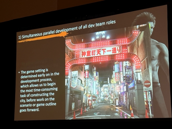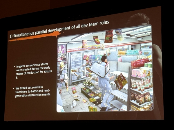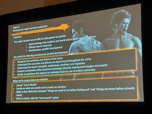이어진 파트에서는 신속한 내러티브 제작을 실현하기 위한 조직적 고안을 공개했는데, RGG 스튜디오에서는 '동시 병렬 개발(Simultaneous Parallel Development)'을 키워드로 여러 팀이 동시에 개발에 임하는 체제를 갖추고 있다. 이를 위해서는 개발 초기 단계에서 '아직 결정되지 않은 부분', '무엇을 시도하고 확인해야 하는지'를 명확히 하여 모호함을 없애는 판단력이 필수다.