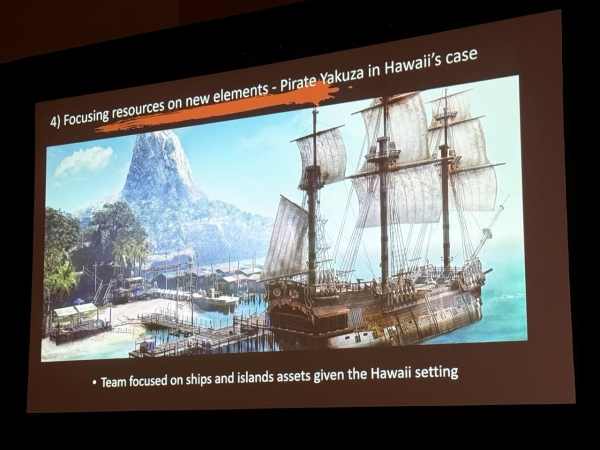 하지만 모든 것을 기존의 것으로만 끝내는 것이 아니라 '신규 요소'에 집중하는 부분에도 많은 리소스를 투입했다. 예를 들어 '용과 같이 7 외전: 이름을 지운 자'의 캐슬은 화려한 시설을 통째로 새로 제작하면서 요코하마, 오사카 등 기존 에셋과 결합해 신선함을 더했다. 또한, 하와이를 배경으로 한 작품에서는 바다, 섬, 배 등 신규 에셋을 중점적으로 다루며 무대 설정을 게임성에 녹여냈다.