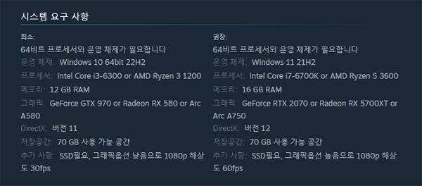 특히 공식 시스템 요구 사항 기준으로 최소 사양인 인텔 코어 i3-6300 혹은 AMD 라이젠3 1200 CPU에 메모리 12기가, 그래픽 카드로는 지포스 GTX 970 혹은 라데온 RX580에서도 플레이가 가능한 것으로 확인되면서 10년 전 PC 사용자까지 배려해 눈길을 모았다.