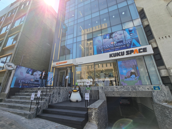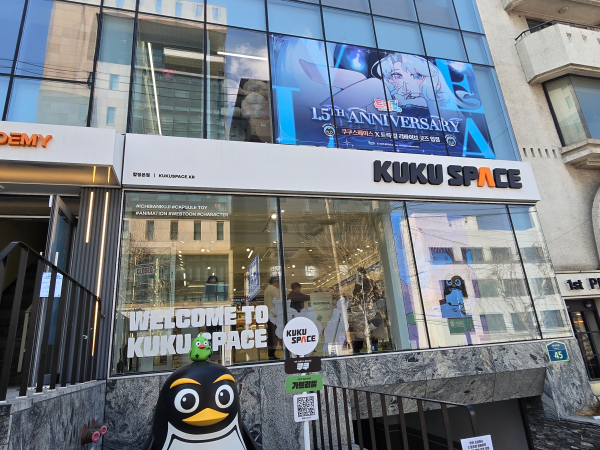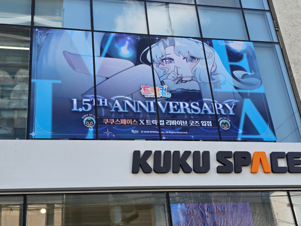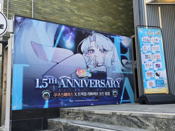 매장의 2층 외벽과 1층 입구 앞에는 '트릭컬 리바이브'가 1.5주년을 맞아 쿠쿠스페이스에 입점했다는 대형 현수막이 붙어 있다.