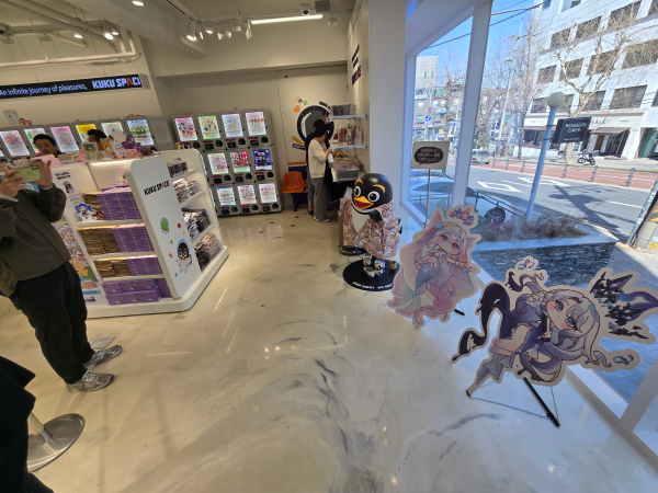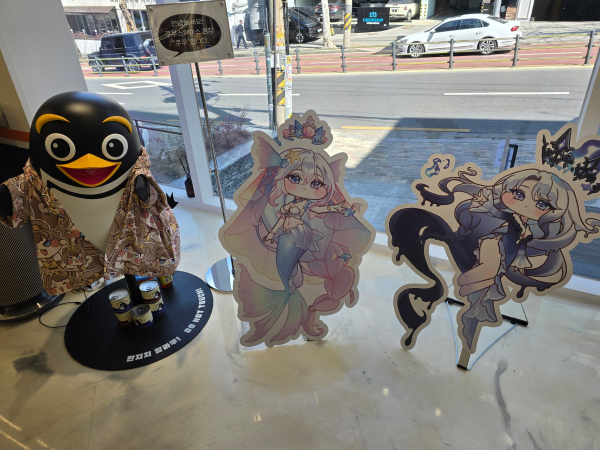 입구에는 '트릭컬 리바이브'의 인기 캐릭터인 벨라의 등신대가 마련되어 있다. 그리고 왼쪽의 펭귄은 쿠쿠스페이스의 캐릭터인데, 자세히 보면 버터단 가디건을 입고 있다.