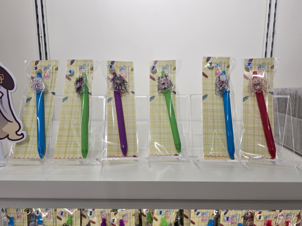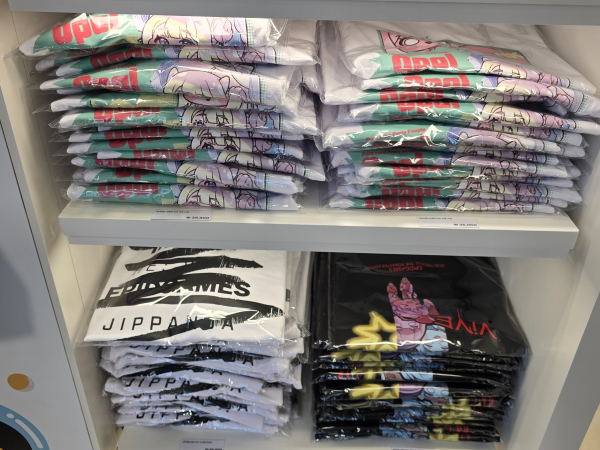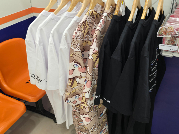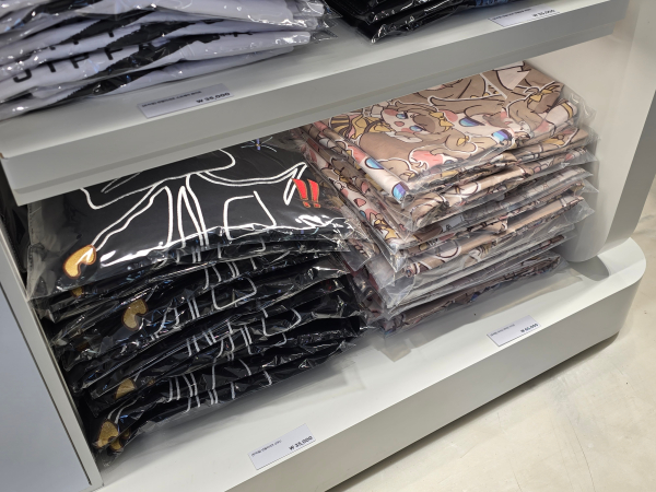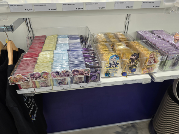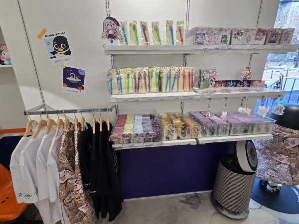 벽에 마련된 굿즈 판매대다. 이곳에서는 아크릴 키링과 아크릴 볼펜, 노트북 스티커, 책발피, 피규어 마그넷이 전시되어 있다. 그리고 반팔 티셔츠와 가디건의 실물이 전시되어, 자신의 몸에 맞는 사이즈를 확인해볼 수 있다.